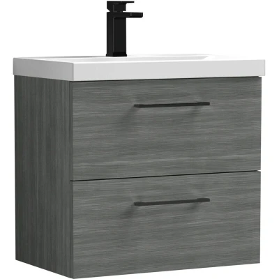 Balterley 600mm Wall Hung Bathroom 2 Drawer Vanity Unit and 1 Tap Hole Ceramic Basin, Woodgrain Anthracite with Black Handles