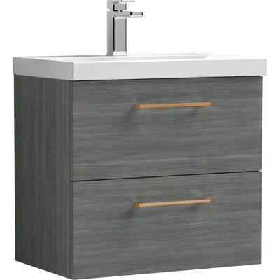 Balterley 600mm Wall Hung Bathroom 2 Drawer Vanity Unit and 1 Tap Hole Ceramic Basin, Woodgrain Anthracite with Copper Handles