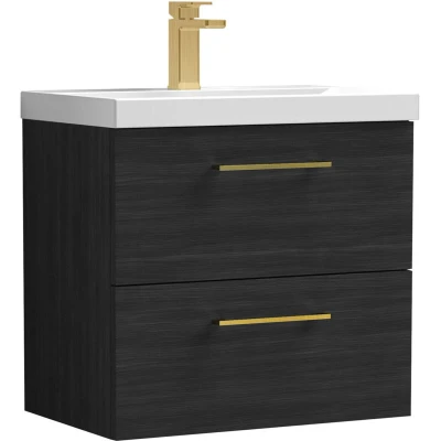 Balterley 600mm Wall Hung Bathroom 2 Drawer Vanity Unit and 1 Tap Hole Ceramic Basin, Woodgrain Black with Brushed Brass Handles