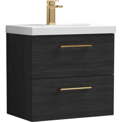 Balterley 600mm Wall Hung Bathroom 2 Drawer Vanity Unit and 1 Tap Hole Ceramic Basin, Woodgrain Black with Brushed Pewter Handles