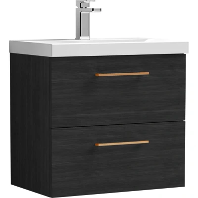 Balterley 600mm Wall Hung Bathroom 2 Drawer Vanity Unit and 1 Tap Hole Ceramic Basin, Woodgrain Black with Copper Handles Designed to bring style and practicality together, this unit creates a clean, modern focal point in your bathroom. Its wall-hung look enhances the feeling of space while keeping essentials neatly tucked away. Perfect for everyday living. Crafted from high-quality materials, this vanity unit is built to last with a durable finish that stands up to daily use. The soft-close drawer mechanism ensures smooth, quiet operation while protecting the unit from wear and tear. Precision manufacturing delivers a sleek design with reliable performance you can trust. Product Highlights: Woodgrain Finish: Stylish bathroom vanity unit with a durable woodgrain finish that brings natural warmth and texture to your bathroom décor. Wall Hung Design: Contemporary bathroom vanity unit with a space-saving wall-hung design that enhances floor space, creates a modern floating look, and