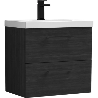Balterley 600mm Wall Hung Bathroom 2 Drawer Vanity Unit and 1 Tap Hole Ceramic Basin, Woodgrain Black with Handles