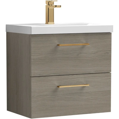 Balterley 600mm Wall Hung Bathroom 2 Drawer Vanity Unit and 1 Tap Hole Ceramic Basin, Woodgrain Mid Oak with Brushed Bronze Handles