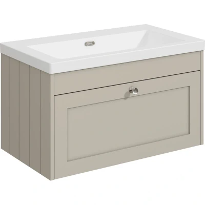 Balterley 800mm Wall Hung 1 Drawer Unit with Minimalist Basin No Tap Hole - Pebble Grey Subtle modern and practical this pebble grey wall hung vanity features a minimalist no tap hole basin with generous concealed storage. Fully assembled with a soft close drawer and backed by a 5 year guarantee it is a reliable choice for contemporary bathrooms. The Balterley 800mm Wall Hung 1 Drawer Unit with Minimalist Basin No Tap Hole in Pebble Grey blends soft neutral styling with everyday functionality. The 800mm cabinet provides ample concealed storage for toiletries towels and essentials while the no tap hole basin allows use with wall mounted or bespoke taps for a clean streamlined finish. The soft close drawer ensures smooth quiet use and the wall hung design helps open up the floor space. Supplied fully assembled and finished in pebble grey this vanity delivers practical storage with understated modern appeal. Product Highlights: Pebble Grey Finish: A smooth pebble grey finish creates a