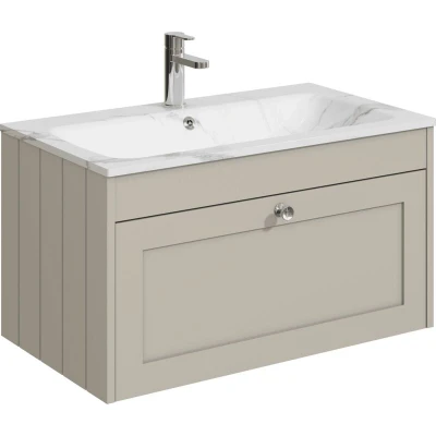 Balterley 800mm Wall Hung 1 Drawer Unit with Stone Basin 1 Tap Hole, Pebble Grey Neutral stylish and practical this pebble grey wall hung vanity features a durable stone basin with 1 tap hole and generous concealed storage. Fully assembled with a soft close drawer and backed by a 5 year guarantee it is a dependable choice for modern bathrooms. The Balterley 800mm Wall Hung 1 Drawer Unit with Stone Basin 1 Tap Hole in Pebble Grey blends subtle contemporary styling with everyday functionality. The 800mm cabinet provides ample concealed storage for toiletries towels and essentials while the robust stone basin includes a single tap hole suited to a mono mixer tap. The soft close drawer ensures smooth quiet use and the wall hung design helps open up the floor space. Supplied fully assembled and finished in pebble grey this vanity delivers practical storage with a calm versatile look. Product Highlights: Pebble Grey Finish: A soft pebble grey finish creates a calm understated look for