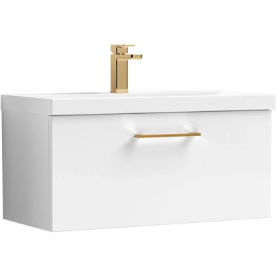 Balterley 800mm Wall Hung Bathroom 1 Drawer Vanity Unit and Tap Hole Ceramic Basin, Gloss White with Brushed Bronze Handle