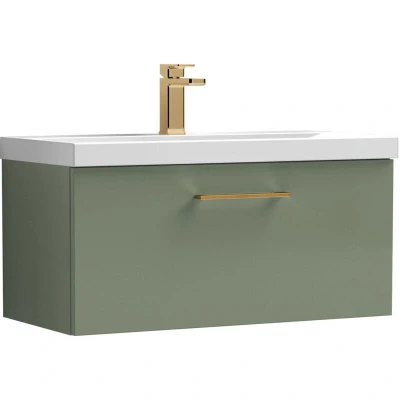 ManoManoBalterley 800mm Wall Hung Bathroom 1 Drawer Vanity Unit and 1 Tap Hole Ceramic Basin, Satin Green with Brushed Bronze Handle Designed to bring style and practicality together, this unit creates a clean, modern focal point in your bathroom. Its wall-hung look enhances the feeling of space while keeping essentials neatly tucked away. Perfect for everyday living. Crafted from high-quality materials, this vanity unit is built to last with a durable finish that stands up to daily use. The soft-close drawer mechanism ensures smooth, quiet operation while protecting the unit from wear and tear. Precision manufacturing delivers a sleek design with reliable performance you can trust. Product Highlights: Satin Finish: Elegant bathroom vanity unit with a smooth satin finish that adds timeless sophistication and a touch of luxury. Wall Hung Design: Contemporary bathroom vanity unit with a space-saving wall-hung design that enhances floor space, creates a modern floating look, and makes everyday