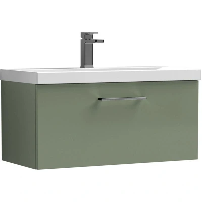 Balterley 800mm Wall Hung Bathroom 1 Drawer Vanity Unit and Tap Hole Ceramic Basin, Satin Green with Brushed Pewter Handle