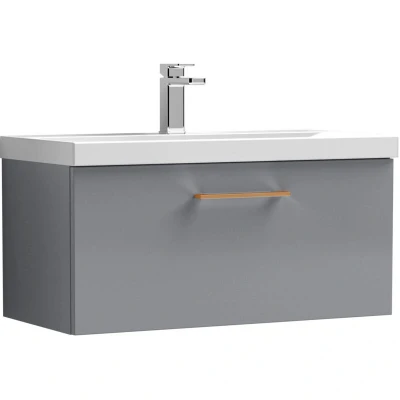 Balterley 800mm Wall Hung Bathroom 1 Drawer Vanity Unit and Tap Hole Ceramic Basin, Satin Grey with Copper Handle