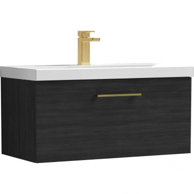 Balterley 800mm Wall Hung Bathroom 1 Drawer Vanity Unit and Tap Hole Ceramic Basin, Woodgrain Black with Brushed Brass Handle