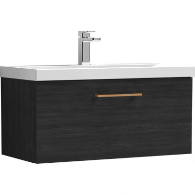 Balterley 800mm Wall Hung Bathroom 1 Drawer Vanity Unit and Tap Hole Ceramic Basin, Woodgrain Black with Copper Handle