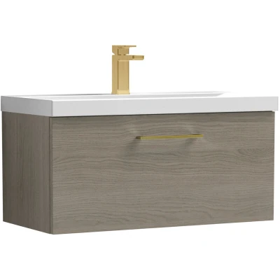 Balterley 800mm Wall Hung Bathroom 1 Drawer Vanity Unit and 1 Tap Hole Ceramic Basin, Woodgrain Mid Oak with Brushed Brass Handle Designed to bring style and practicality together, this unit creates a clean, modern focal point in your bathroom. Its wall-hung look enhances the feeling of space while keeping essentials neatly tucked away. Perfect for everyday living. Crafted from high-quality materials, this vanity unit is built to last with a durable finish that stands up to daily use. The soft-close drawer mechanism ensures smooth, quiet operation while protecting the unit from wear and tear. Precision manufacturing delivers a sleek design with reliable performance you can trust. Product Highlights: Woodgrain Finish: Stylish bathroom vanity unit with a durable woodgrain finish that brings natural warmth and texture to your bathroom décor. Wall Hung Design: Contemporary bathroom vanity unit with a space-saving wall-hung design that enhances floor space, creates a modern floating look,