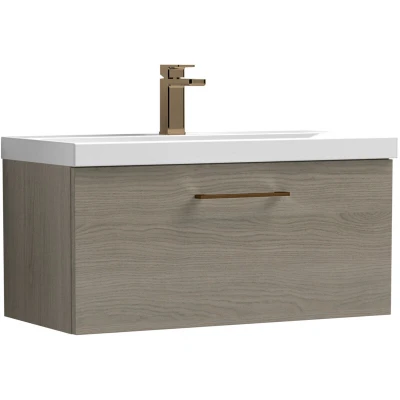Balterley 800mm Wall Hung Bathroom 1 Drawer Vanity Unit and 1 Tap Hole Ceramic Basin, Woodgrain Mid Oak with Brushed Bronze Handle Designed to bring style and practicality together, this unit creates a clean, modern focal point in your bathroom. Its wall-hung look enhances the feeling of space while keeping essentials neatly tucked away. Perfect for everyday living. Crafted from high-quality materials, this vanity unit is built to last with a durable finish that stands up to daily use. The soft-close drawer mechanism ensures smooth, quiet operation while protecting the unit from wear and tear. Precision manufacturing delivers a sleek design with reliable performance you can trust. Product Highlights: Woodgrain Finish: Stylish bathroom vanity unit with a durable woodgrain finish that brings natural warmth and texture to your bathroom décor. Wall Hung Design: Contemporary bathroom vanity unit with a space-saving wall-hung design that enhances floor space, creates a modern floating look,