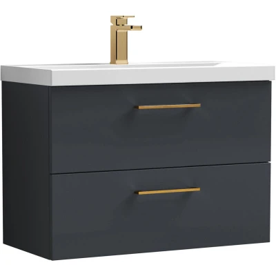 Balterley 800mm Wall Hung Bathroom 2 Drawer Vanity Unit and 1 Tap Hole Ceramic Basin, Satin Dark Grey with Brushed Bronze Handles
