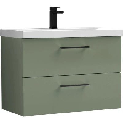 Balterley 800mm Wall Hung Bathroom 2 Drawer Vanity Unit and 1 Tap Hole Ceramic Basin, Satin Green with Black Handles