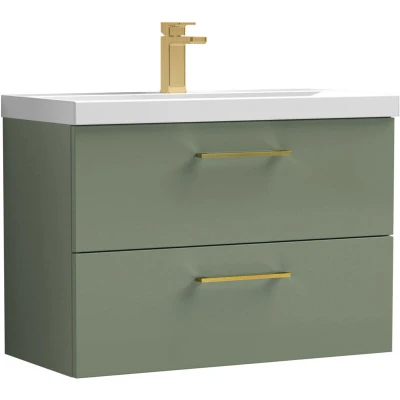 ManoManoBalterley 800mm Wall Hung Bathroom 2 Drawer Vanity Unit and 1 Tap Hole Ceramic Basin, Satin Green with Brushed Brass Handles Designed to bring style and practicality together, this unit creates a clean, modern focal point in your bathroom. Its wall-hung look enhances the feeling of space while keeping essentials neatly tucked away. Perfect for everyday living. Crafted from high-quality materials, this vanity unit is built to last with a durable finish that stands up to daily use. The soft-close drawer mechanism ensures smooth, quiet operation while protecting the unit from wear and tear. Precision manufacturing delivers a sleek design with reliable performance you can trust. Product Highlights: Satin Finish: Elegant bathroom vanity unit with a smooth satin finish that adds timeless sophistication and a touch of luxury. Wall Hung Design: Contemporary bathroom vanity unit with a space-saving wall-hung design that enhances floor space, creates a modern floating look, and makes everyday