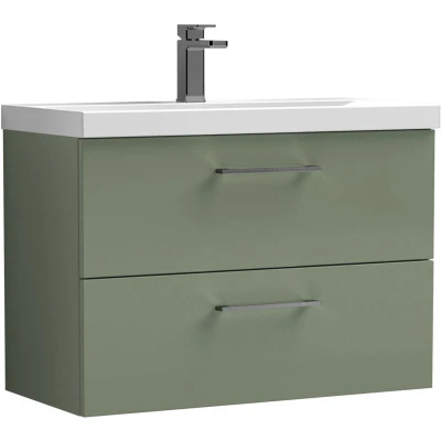 ManoManoBalterley 800mm Wall Hung Bathroom 2 Drawer Vanity Unit and 1 Tap Hole Ceramic Basin, Satin Green with Brushed Pewter Handles Designed to bring style and practicality together, this unit creates a clean, modern focal point in your bathroom. Its wall-hung look enhances the feeling of space while keeping essentials neatly tucked away. Perfect for everyday living. Crafted from high-quality materials, this vanity unit is built to last with a durable finish that stands up to daily use. The soft-close drawer mechanism ensures smooth, quiet operation while protecting the unit from wear and tear. Precision manufacturing delivers a sleek design with reliable performance you can trust. Product Highlights: Satin Finish: Elegant bathroom vanity unit with a smooth satin finish that adds timeless sophistication and a touch of luxury. Wall Hung Design: Contemporary bathroom vanity unit with a space-saving wall-hung design that enhances floor space, creates a modern floating look, and makes everyday