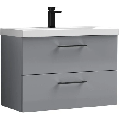 Balterley 800mm Wall Hung Bathroom 2 Drawer Vanity Unit and 1 Tap Hole Ceramic Basin, Satin Grey with Black Handles