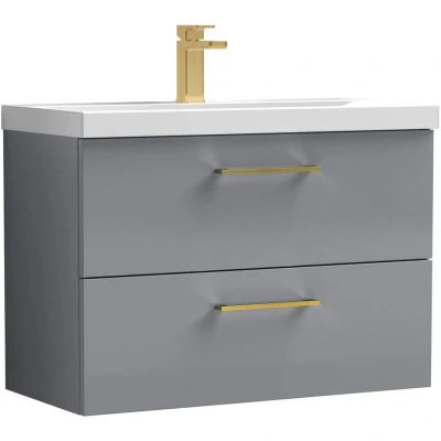 Balterley 800mm Wall Hung Bathroom 2 Drawer Vanity Unit and 1 Tap Hole Ceramic Basin, Satin Grey with Brushed Brass Handles