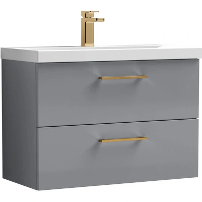 Balterley 800mm Wall Hung Bathroom 2 Drawer Vanity Unit and 1 Tap Hole Ceramic Basin, Satin Grey with Brushed Bronze Handles