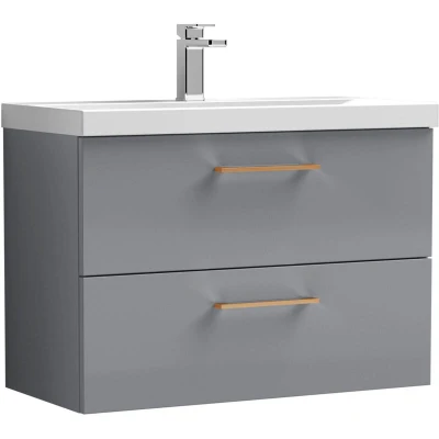 Balterley 800mm Wall Hung Bathroom 2 Drawer Vanity Unit and 1 Tap Hole Ceramic Basin, Satin Grey with Copper Handles