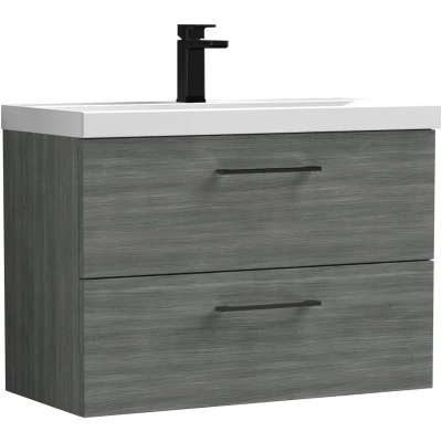 Balterley 800mm Wall Hung Bathroom 2 Drawer Vanity Unit and 1 Tap Hole Ceramic Basin, Woodgrain Anthracite with Black Handles