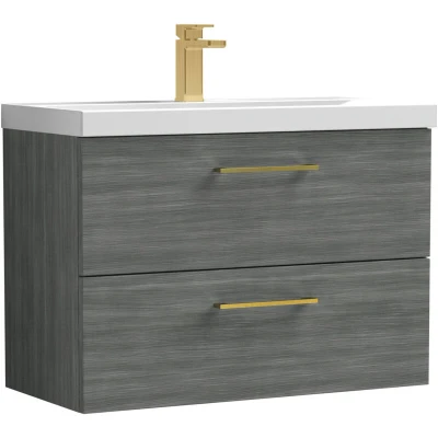 Balterley 800mm Wall Hung Bathroom 2 Drawer Vanity Unit and 1 Tap Hole Ceramic Basin, Woodgrain Anthracite with Brushed Brass Handles