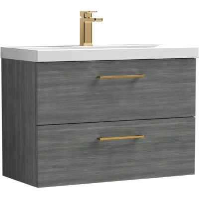 Balterley 800mm Wall Hung Bathroom 2 Drawer Vanity Unit and 1 Tap Hole Ceramic Basin, Woodgrain Anthracite with Brushed Bronze Handles