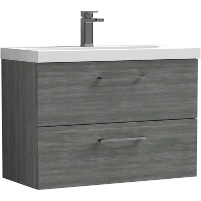 Balterley 800mm Wall Hung Bathroom 2 Drawer Vanity Unit and 1 Tap Hole Ceramic Basin, Woodgrain Anthracite with Brushed Pewter Handles Designed to bring style and practicality together, this unit creates a clean, modern focal point in your bathroom. Its wall-hung look enhances the feeling of space while keeping essentials neatly tucked away. Perfect for everyday living. Crafted from high-quality materials, this vanity unit is built to last with a durable finish that stands up to daily use. The soft-close drawer mechanism ensures smooth, quiet operation while protecting the unit from wear and tear. Product Highlights: Woodgrain Finish: Stylish bathroom vanity unit with a durable woodgrain finish that brings natural warmth and texture to your bathroom décor. Wall Hung Design: Contemporary bathroom vanity unit with a space-saving wall-hung design that enhances floor space, creates a modern floating look, and makes everyday cleaning simple and hassle-free. Square Shape Design: A sleek