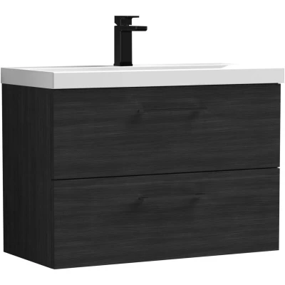 Balterley 800mm Wall Hung Bathroom 2 Drawer Vanity Unit and 1 Tap Hole Ceramic Basin, Woodgrain Black with Black Handles Designed to bring style and practicality together, this unit creates a clean, modern focal point in your bathroom. Its wall-hung look enhances the feeling of space while keeping essentials neatly tucked away. Perfect for everyday living. Crafted from high-quality materials, this vanity unit is built to last with a durable finish that stands up to daily use. The soft-close drawer mechanism ensures smooth, quiet operation while protecting the unit from wear and tear. Precision manufacturing delivers a sleek design with reliable performance you can trust. Product Highlights: Woodgrain Finish: Stylish bathroom vanity unit with a durable woodgrain finish that brings natural warmth and texture to your bathroom décor. Wall Hung Design: Contemporary bathroom vanity unit with a space-saving wall-hung design that enhances floor space, creates a modern floating look, and makes