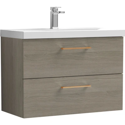 Balterley 800mm Wall Hung Bathroom 2 Drawer Vanity Unit and 1 Tap Hole Ceramic Basin, Woodgrain Mid Oak with Copper Handles