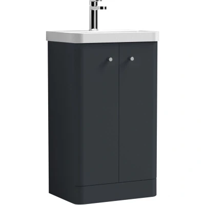 General description Add modern depth and practicality to your bathroom with the Floor Standing 2 Door Vanity Unit with Ceramic Basin - 500mm in Dark Grey. Its slim, thin-edge basin and space-saving storage make it perfect for smaller spaces. The bold dark grey finish makes a striking statement, while the tap and waste are sold separately, allowing you to create a setup that suits your preferences. A coordinating WC unit is also available for a seamlessly designed bathroom. Combining high-quality materials and a modern curved design, this vanity unit will become a much-loved piece in your bathroom. Technical specifications Dimensions: W: 505 mm D: 355 mm H: 863 mm Type: Floor standing Material: Ceramic basin with high-quality cabinet Soft-close drawer mechanism 1 tap hole in the basin Installation Supplied fully assembled for quicker, hassle-free installation Simply mount and connect plumbing Usage Ideal for high-traffic or family bathrooms Helps keep your bathroom clutter-free with