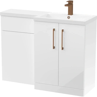 Balterley Gloss White Bathroom Vanity Unit with Basin & WC, Brushed Bronze Handles, Right Hand, 1100mm x 390mm