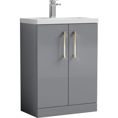 Balterley Level Compact Bathroom Cloakroom Vanity Basin Unit with Ceramic Basin, Brushed Brass Handles, 600mm, Satin Grey
