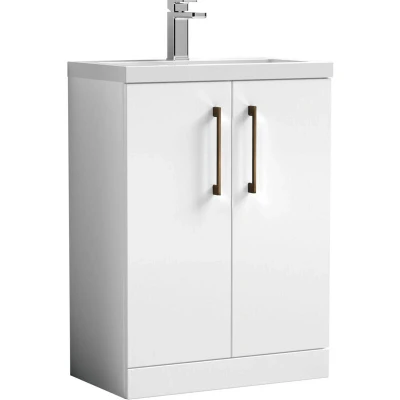 Balterley Level Compact Bathroom Cloakroom Vanity Basin Unit with Ceramic Basin, Brushed Bronze Handles, 600mm, Gloss White