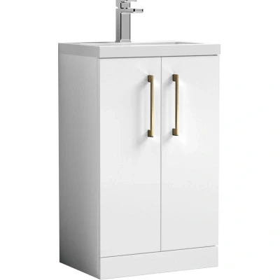 Balterley Level Compact Bathroom Cloakroom Vanity Basin Unit with Polymarble Basin, Brushed Brass Handles, 500mm, Gloss White