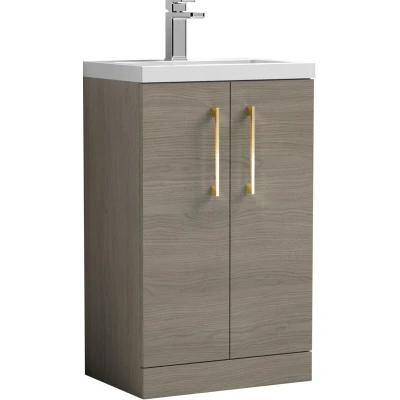 Woodgrain Mid Oak Finish: A natural mid oak woodgrain finish rich in warmth and character, complemented by the gloss white basin for a timeless blend of organic texture and clean modern lines. Brushed Brass Handles: Brushed brass handles provide a warm, premium contrast and a comfortable, durable grip, adding style and elegance to your bathroom. Compact Cloakroom Design: Space-saving floor standing unit is ideal for small bathrooms or en-suites, offering practical storage without cluttering the floor. Soft Close Doors: Smooth soft close doors prevent slamming, reduce noise, and protect the unit from damage, creating a quieter, safer bathroom environment. Generous Storage: Includes an internal shelf to neatly organise toiletries, towels, and bathroom essentials, keeping your space tidy and clutter-free. Polymarble Basin Included: Supplied with a high-quality polymarble basin pre-drilled with one tap hole, offering a smooth, scratch-resistant, and easy-clean surface. Dimensions: H: 840 x W: 503 x D: 353mm Warranty: 5-year manufacturer’s guarantee