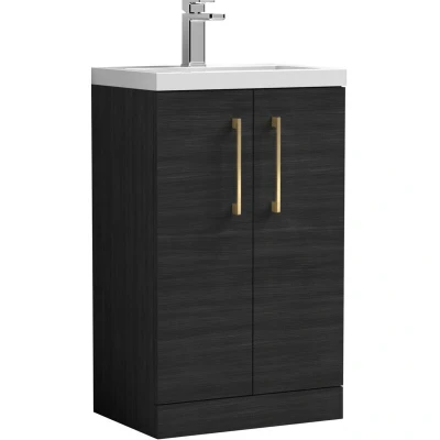 Charcoal Black Finish: A bold black woodgrain finish with rich texture, delivering striking contemporary style while the gloss white basin adds a clean, refined balance. Brushed Brass Handles: Brushed brass handles provide a warm, premium contrast and a comfortable, durable grip, adding style and elegance to your bathroom. Compact Cloakroom Design: Space-saving floor standing unit is ideal for small bathrooms or en-suites, offering practical storage without cluttering the floor. Soft Close Doors: Smooth soft close doors prevent slamming, reduce noise, and protect the unit from damage, creating a quieter, safer bathroom environment. Generous Storage: Includes an internal shelf to neatly organise toiletries, towels, and bathroom essentials, keeping your space tidy and clutter-free. Polymarble Basin Included: Supplied with a high-quality polymarble basin pre-drilled with one tap hole, offering a smooth, scratch-resistant, and easy-clean surface. Dimensions: H: 840 x W: 520 x D: 360mm Warranty: 5-year manufacturer’s guarantee