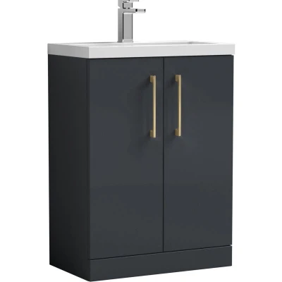 Satin Dark Grey Finish: A luxurious satin dark grey finish offering depth and elegance, perfectly offset by the gloss white basin for a modern designer contrast. Brushed Brass Handles: Brushed brass handles provide a warm, premium contrast and a comfortable, durable grip, adding style and elegance to your bathroom. Compact Cloakroom Design: Space-saving floor standing unit is ideal for small bathrooms or en-suites, offering practical storage without cluttering the floor. Soft Close Doors: Smooth soft close doors prevent slamming, reduce noise, and protect the unit from damage, creating a quieter, safer bathroom environment. Generous Storage: Includes an internal shelf to neatly organise toiletries, towels, and bathroom essentials, keeping your space tidy and clutter-free. Polymarble Basin Included: Supplied with a high-quality polymarble basin pre-drilled with one tap hole, offering a smooth, scratch-resistant, and easy-clean surface. Dimensions: H: 840 x W: 605 x D: 360mm Warranty: 5-year manufacturer’s guarantee