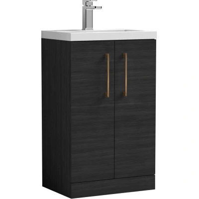 Charcoal Black Finish: A bold black woodgrain finish with rich texture, delivering striking contemporary style while the gloss white basin adds a clean, refined balance. Brushed Bronze Handles: Brushed bronze handles add a warm, premium contrast and provide a comfortable, durable grip, combining style and functionality. Compact Cloakroom Design: Space-saving floor standing unit is ideal for small bathrooms or en-suites, offering practical storage without cluttering the floor. Soft Close Doors: Smooth soft close doors prevent slamming, reduce noise, and protect the unit from damage, creating a quieter, safer bathroom environment. Generous Storage: Includes an internal shelf to neatly organise toiletries, towels, and bathroom essentials, keeping your space tidy and clutter-free. Polymarble Basin Included: Supplied with a high-quality polymarble basin pre-drilled with one tap hole, offering a smooth, scratch-resistant, and easy-clean surface. Dimensions: H: 840 x W: 520 x D: 360mm Warranty: 5-year manufacturer’s guarantee