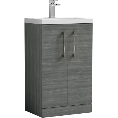 Anthracite Woodgrain Finish: A deep, textured anthracite woodgrain finish that brings understated warmth and modern sophistication, beautifully contrasted by the crisp gloss white basin. Brushed Pewter Handles: Brushed pewter handles create a modern, premium contrast and provide a comfortable, durable grip for effortless daily use. Compact Cloakroom Design: Space-saving floor standing unit is ideal for small bathrooms or en-suites, offering practical storage without cluttering the floor. Soft Close Doors: Smooth soft close doors prevent slamming, reduce noise, and protect the unit from damage, creating a quieter, safer bathroom environment. Generous Storage: Includes an internal shelf to neatly organise toiletries, towels, and bathroom essentials, keeping your space tidy and clutter-free. Polymarble Basin Included: Supplied with a high-quality polymarble basin pre-drilled with one tap hole, offering a smooth, scratch-resistant, and easy-clean surface. Dimensions: H: 840 x W: 503 x D: 353mm Warranty: 5-year manufacturer’s guarantee