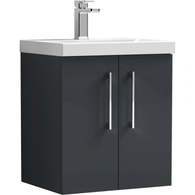 Balterley Contemporary Bathroom 2 Soft Close Door & Thin-Edge Wall Hung Vanity Unit Basin, Dark Grey, 500mm The Balterley 500mm Wall Hung 2-Door Vanity combines sleek style with practical design. Its Dark Grey finish and wall-mounted setup maximise space, giving your bathroom a cleaner, more organised look. This wall hung vanity unit is perfect for smaller bathrooms or for creating a modern, open feel. Featuring soft-close doors, a durable thin-edge ceramic basin, and ample storage, it keeps your bathroom tidy, functional, and visually appealing. Product Highlights: Stylish Dark Grey Finish: Adds a bold, modern touch that elevates any bathroom, creating a sleek, contemporary look while complementing various décor styles and adding depth and sophistication to the space. Space-Saving Wall-Hung Design: Wall-mounted to free up floor space, creating the illusion of a larger bathroom while making cleaning underneath quick, easy, and effortless. Double Door Storage: Two soft-close doors