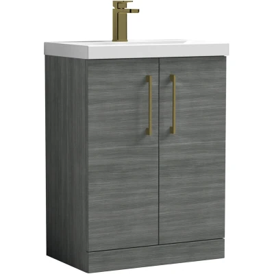 Balterley Level Contemporary Bathroom Floor Standing 2 Door Vanity Unit & Mid Edge Basin, Anthracite Woodgrain, 600mm
