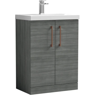 Balterley Level Contemporary Bathroom Floor Standing 2 Door Vanity Unit & Mid Edge Basin, Anthracite Woodgrain, 600mm