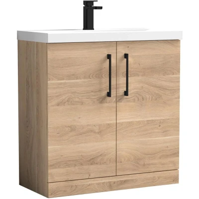Balterley Level Contemporary Bathroom Floor Standing 2-Door Vanity Unit & Mid-Edge Basin, Bleached Oak, 800mm Brighten your bathroom with the Balterley Level vanity unit, finished in a light and airy Bleached Oak. This 800mm floor-standing unit offers a sophisticated coastal aesthetic, providing a spacious storage solution that feels lightweight and modern. The Bleached Oak finish features a subtle, pale woodgrain that adds texture without darkening your space, making it perfect for smaller bathrooms or those lacking natural light. Paired with a precision-cast white ceramic basin, it delivers a clean, cohesive look built to withstand the humid bathroom environment. Product Highlights: Light Oak Finish: The soft, light-toned Bleached Oak finish provides a fresh, modern woodgrain aesthetic that creates an open and inviting atmosphere in any contemporary bathroom. Modern Black Handles: Featuring sleek black D-shape handles that provide a sharp, contemporary contrast against the pale