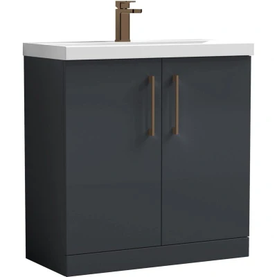 Balterley Level Contemporary Bathroom Floor Standing 2-Door Vanity Unit & Mid-Edge Basin, Dark Grey, 800mm Achieve a bold, urban look with the Balterley Level vanity unit in a stunning Dark Grey finish. This contemporary floor-standing unit offers a perfect balance of moody, modern style and expansive storage, serving as a sophisticated centrepiece for any mid-to-large bathroom. Crafted for long-term durability, the Level range features a smooth, matte-style Dark Grey finish that is both highly tactile and visually striking. Paired with a precision-engineered white vitreous china basin, this unit provides a sharp, high-contrast aesthetic that defines a modern interior. Product Highlights: Moody Dark Grey: The deep, matte Dark Grey finish offers a versatile and sophisticated aesthetic, providing a bold urban look that hides marks and fingerprints effectively. Brushed Bronze Handles: Featuring premium Brushed Bronze D-shape handles that offer a rich, earthy metallic tone, creating a