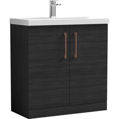 Balterley Level Contemporary Bathroom Floor Standing 2 Soft Close Door & Mid-Edge Vanity Unit Basin, Charcoal Black, 810mm The Balterley Level 800mm vanity unit combines striking charcoal black style with copper handles and generous storage. It’s a practical, space-saving solution designed for modern bathrooms. This Balterley Level floor standing vanity unit with mid-edge basin offers soft close doors, durable materials, and easy-clean surfaces. Ideal for UK bathrooms seeking style, storage, and everyday practicality. Product Highlights: Modern Charcoal Black Finish: Smooth charcoal black finish creates a bold, designer look while being easy to wipe clean, helping keep your bathroom tidy, hygienic, and low maintenance every day. Copper Handle Detail: Elegant copper D-shaped handles add warm contrast to the dark cabinet, enhancing visual appeal while offering a comfortable grip for effortless daily use. Spacious Two-Door Storage: Two soft close doors reveal generous internal storage,