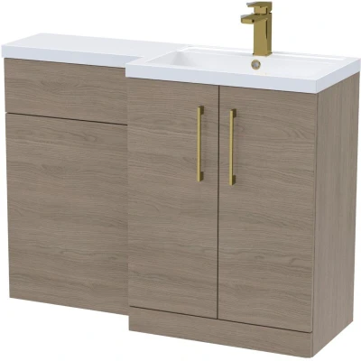 Balterley Mid Oak Bathroom Vanity Unit with Basin & WC, Brushed Brass Handles, Right Hand, 1100mm x 390mm