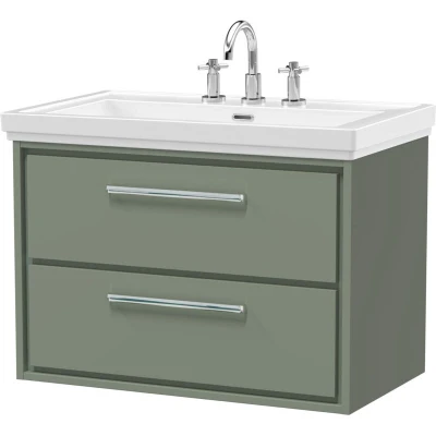 Balterley Modern Bathroom Wall Hung 2 Drawer Vanity Unit with Fireclay Basin, Fern Green, 800mm