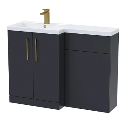 ManoManoBalterley Satin Dark Grey Bathroom Vanity Unit with Basin & WC, Brushed Brass Handles, Left Hand, 1100mm x 390mm Perfect for cloakrooms, ensuites, and smaller bathrooms, this floor-standing combination unit offers ample storage for all your essentials. With a matching WC unit and vanity basin unit complete with basin and worktop, it brings a modern, elegant look to any space. It’s also available in both left-hand and right-hand options to suit your bathroom layout perfectly. Transform your bathroom into a stylish, organised, and calming space with this beautifully coordinated vanity basin and WC combination unit. Designed to bring both elegance and everyday practicality into your home, it creates a seamless, clutter-free environment that enhances the way you use your bathroom. Product Highlights: Space Saving: Perfect for cloakrooms, ensuites, and smaller bathrooms, this unit provides practical storage without compromising on style. Satin Dark Grey: A smooth satin dark grey surface